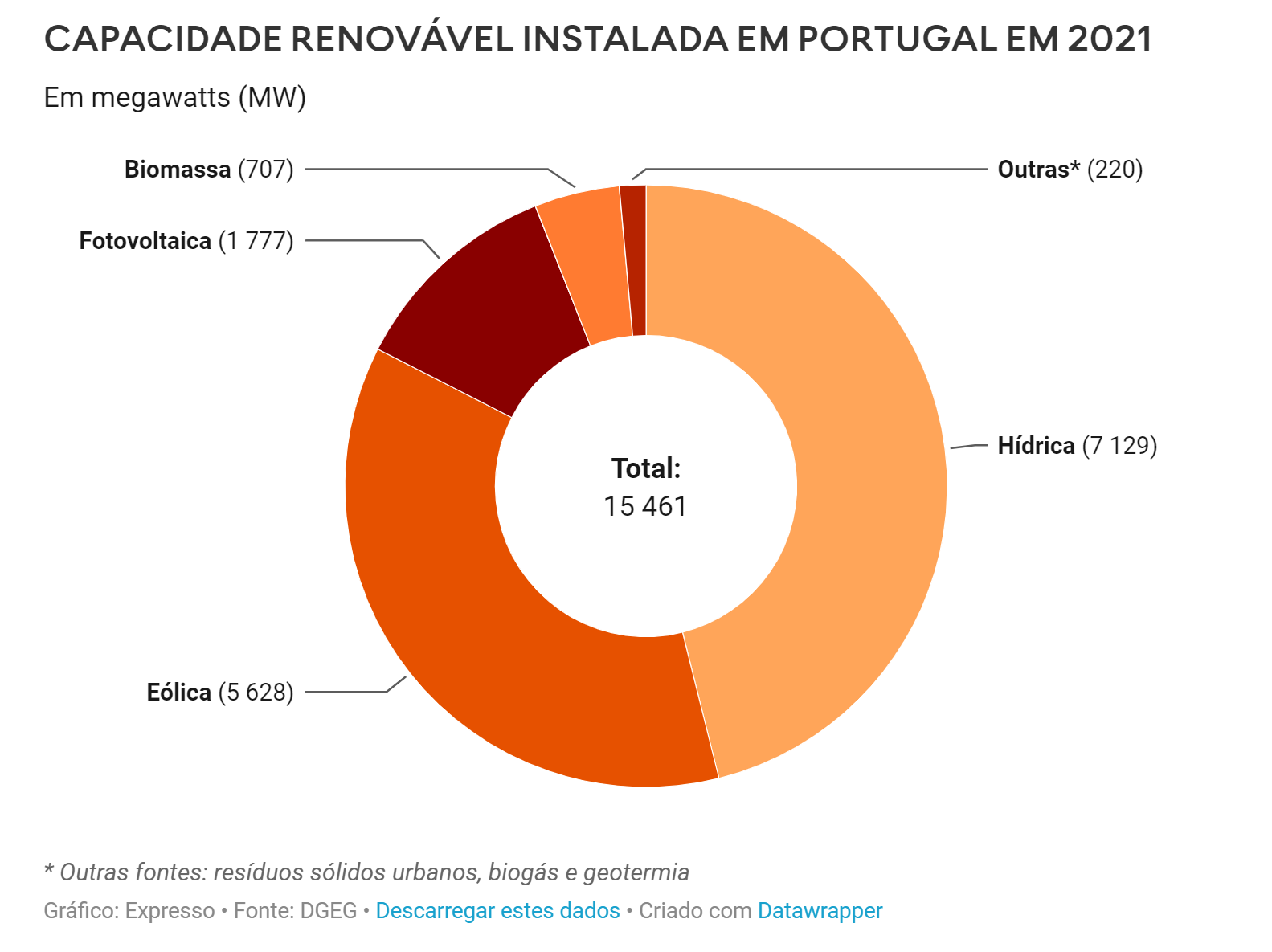 Capacidade de Potência de Energia Renovável instalada em Portugal até final de 2021, Fonte Direção-Geral de Energia e Geologia (DGEG)