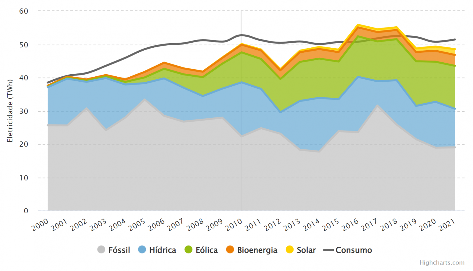 Entre janeiro e julho de 2022 foram produzidos 24 664 GWh de energia elétrica em Portugal Continental, dos quais 55,7% foram de origem renovável e os restantes 44,3% foram de origem fóssil, segundos dados das Redes Energéticas Nacionais (REN).