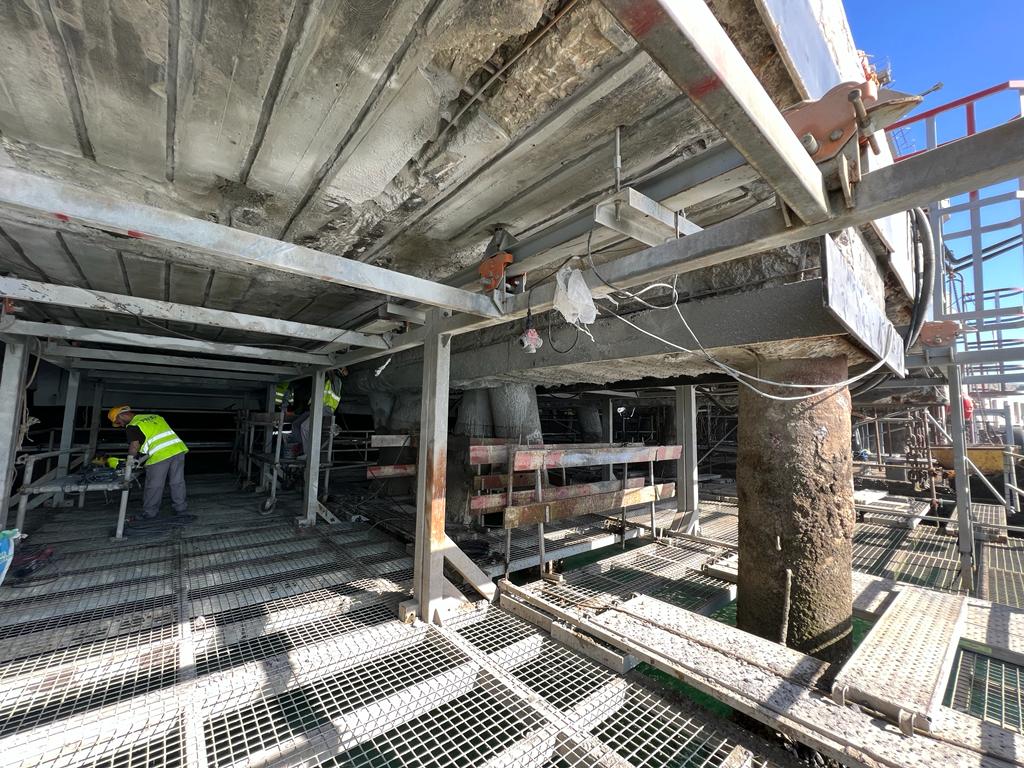 Todos os trabalhos são executados em plataformas de estrutura metálica projetada especificamente para essa empreitada, instalada na parte inferior da laje do cais.