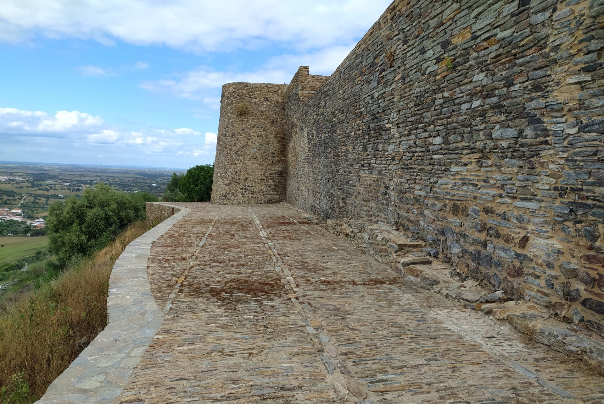 Empreitada de requalificação dos Baluartes Fortificados em Monsaraz, que incluiu a consolidação das muralhas e a reabilitação dos caminhos pedonais e acessos. Os trabalhos incluíram a reabilitação de muralhas em alvenaria de pedra de xisto, a pavimentação em calçada de xisto, a construção de muros e escadas em pedra de granito, e a instalação de portões e escadas de acesso em aço corten.