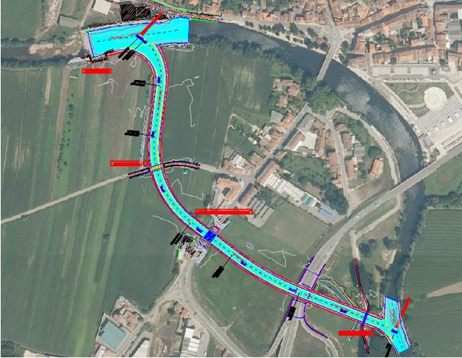 O canal projetado apresenta uma extensão de 791metros, sendo constituído por 4 alinhamentos retos e 3 curvas. A inclinação do leito é de 0,10% e a sua largura é de 12m. A inclinação dos taludes apresenta uma relação de 1/1.5metros.