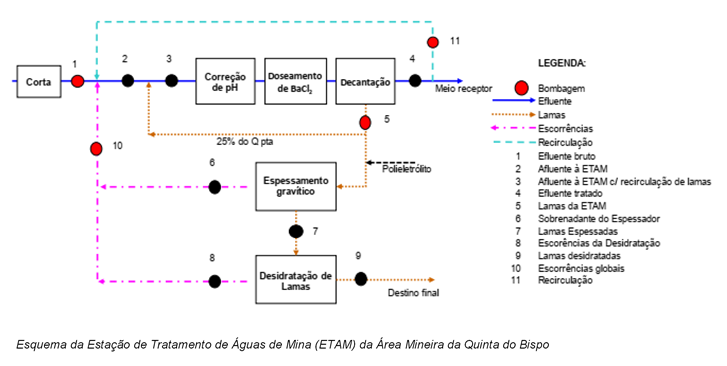 Na primeira fase da obra de Recuperação Ambiental da Antiga Área Mineira da Quinta do Bispo, considerou-se prioritária a construção de uma Estação de Tratamento de Águas de Mina (ETAM) que permita assegurar o adequado tratamento da água acumulada na corta, de forma a permitir nas fases seguintes uma efetiva recuperação ambiental das escombreiras existentes e o seu confinamento na corta, após esvaziamento, além de um conjunto de trabalhos complementares.